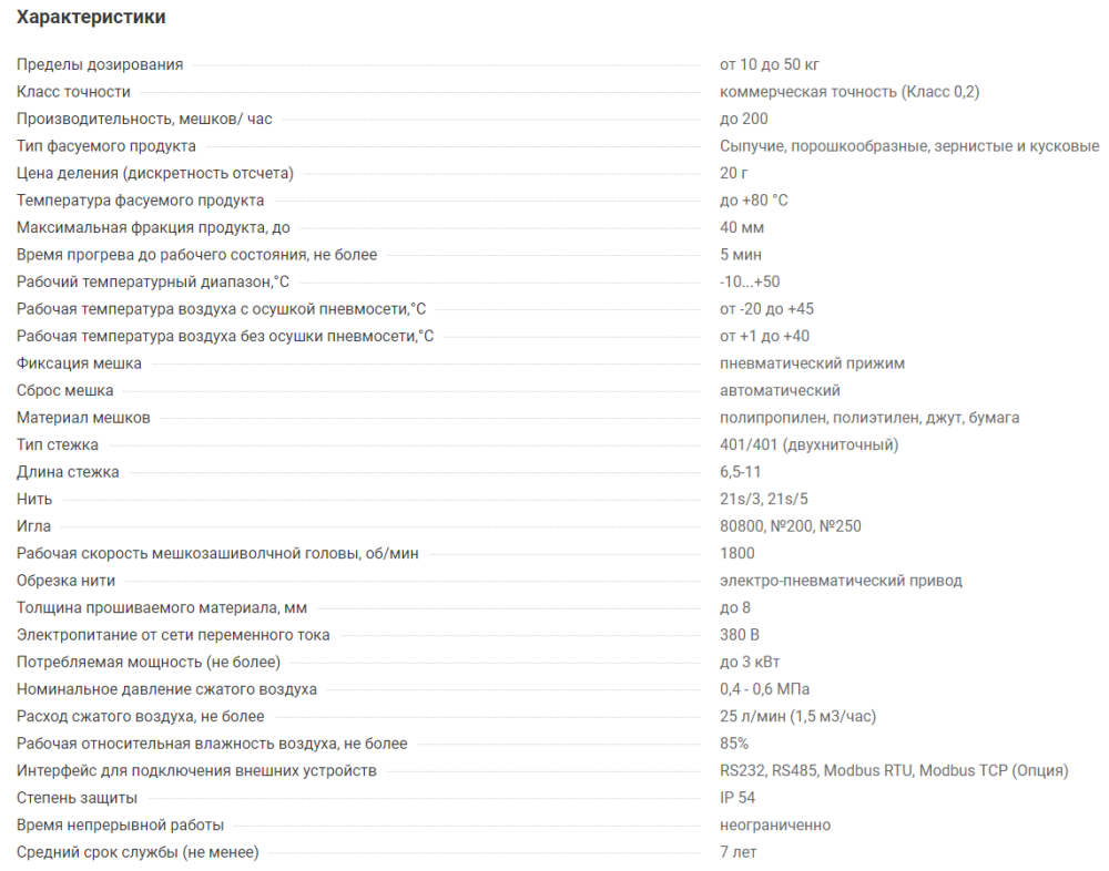 В линию включен дозатор для фасовки, транспортер для отвода мешка в зону зашивки и мешкозашивочная станция с регулировкой под высоту мешка.